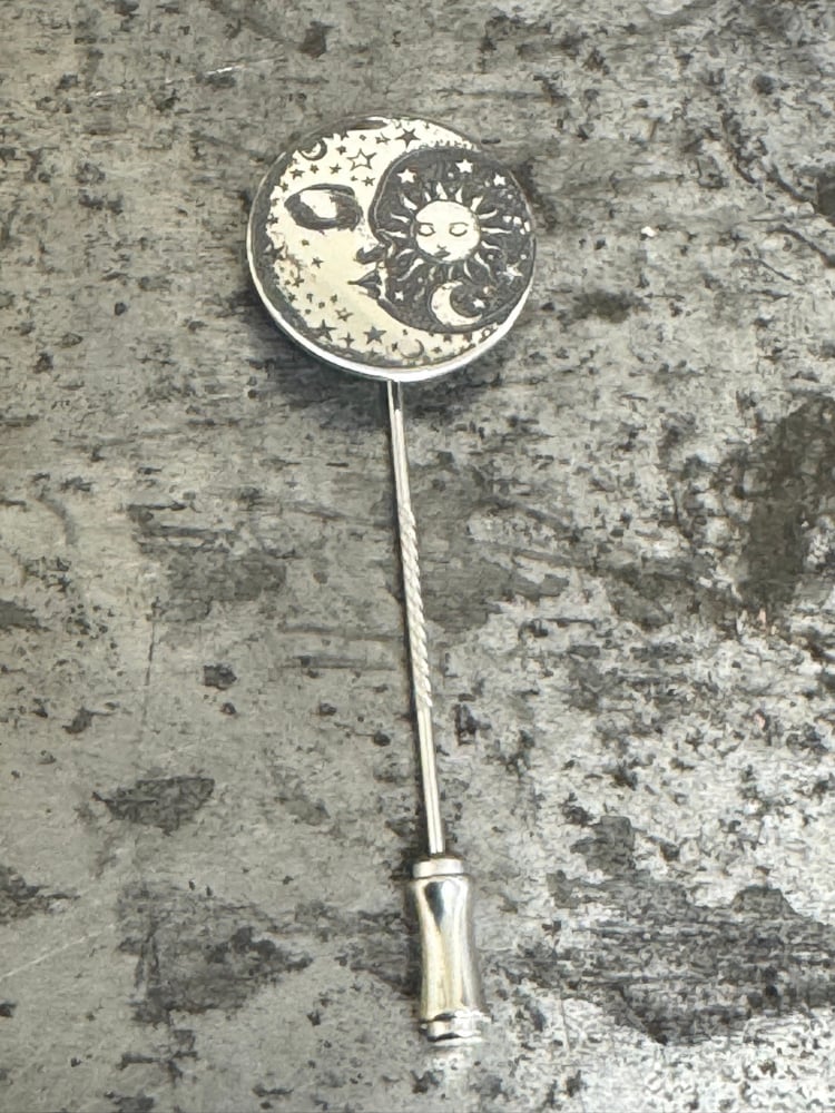 A wonderfully elegant silver stick pin engraved with a beautiful antique image of the Sun & Moon.