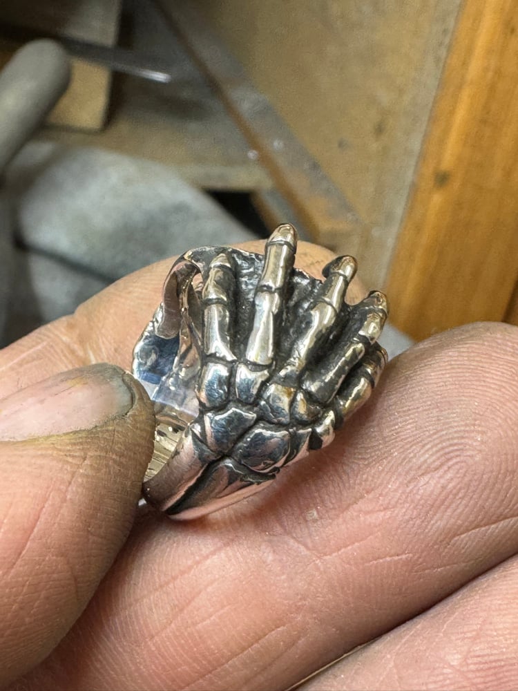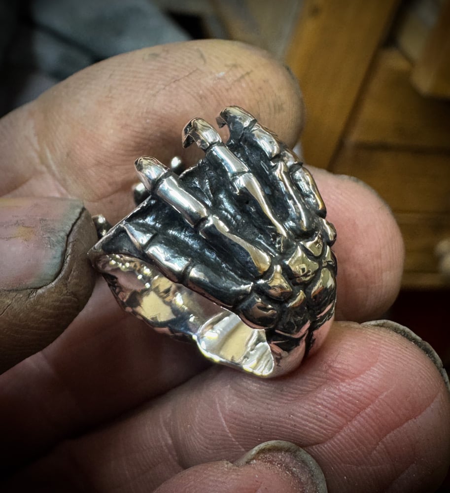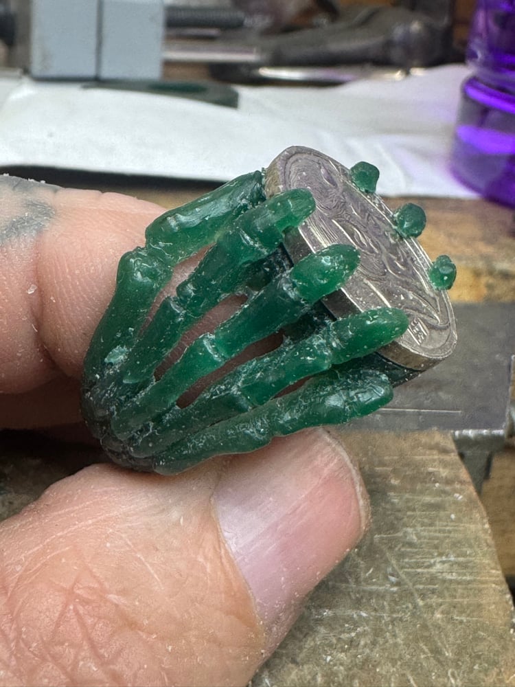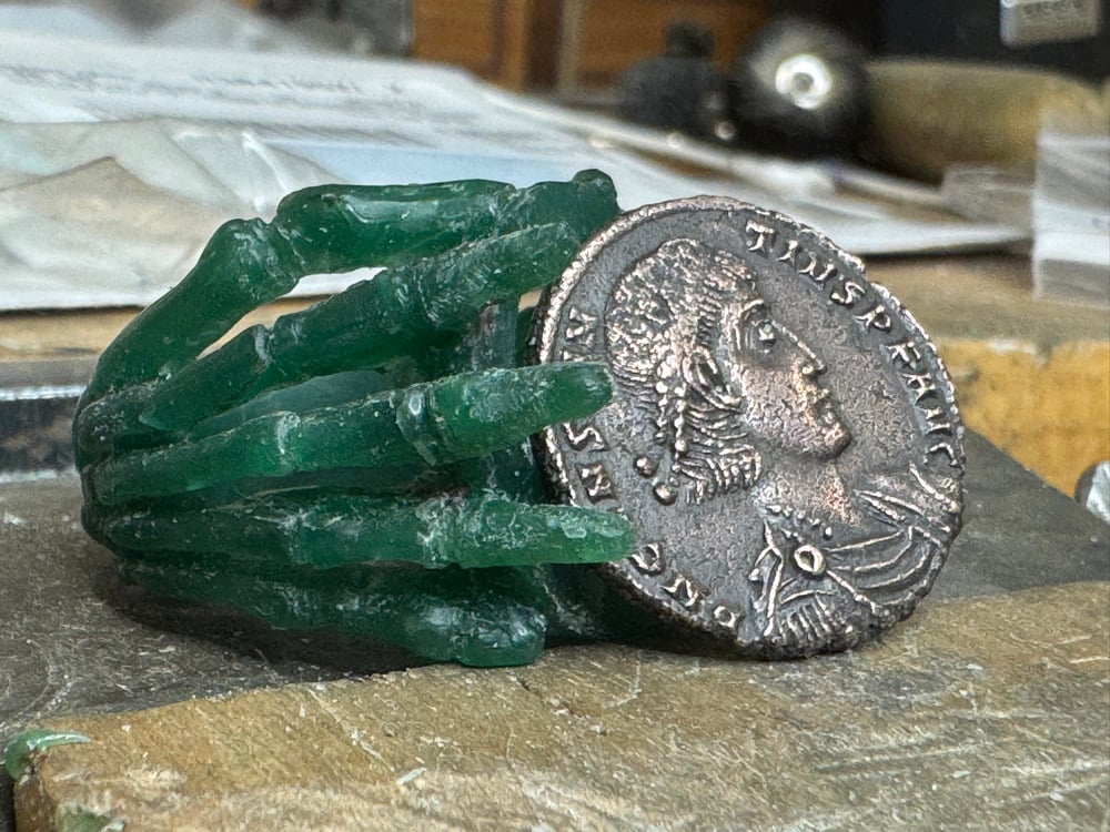 7 days of carving from a block of wax to this, a pair of skeleton hands holding a coin.